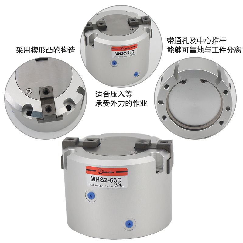 1、斯麥特MHS2系列手指氣缸采用楔形凸輪構(gòu)造,高度方向尺寸小且重量輕;