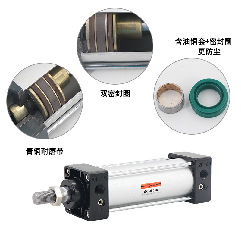 2、活塞密封標(biāo)準(zhǔn)氣缸采用異型雙向密封結(jié)構(gòu),尺寸緊湊,有儲(chǔ)油功能;